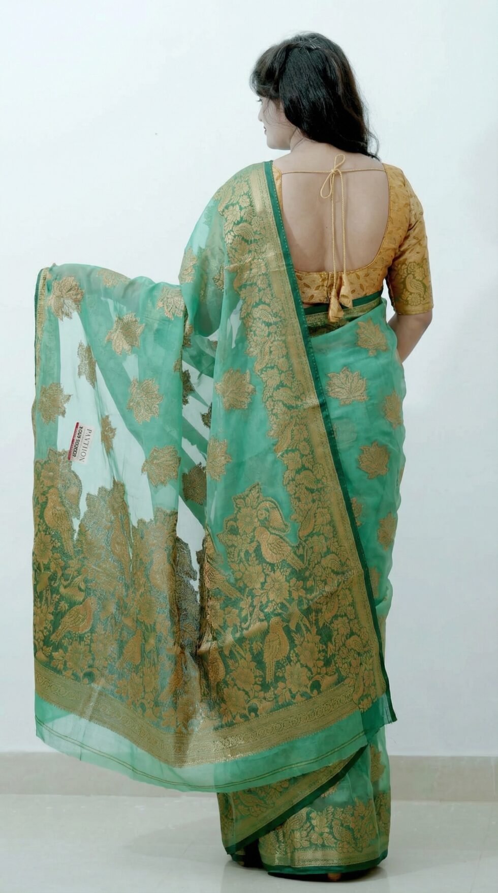 The Paython saree is beautifully crafted from Banarasi Glass Organza fabric, celebrated for its luxurious shine and premium finish. This exquisite fabric lends the saree a light yet rich feel,