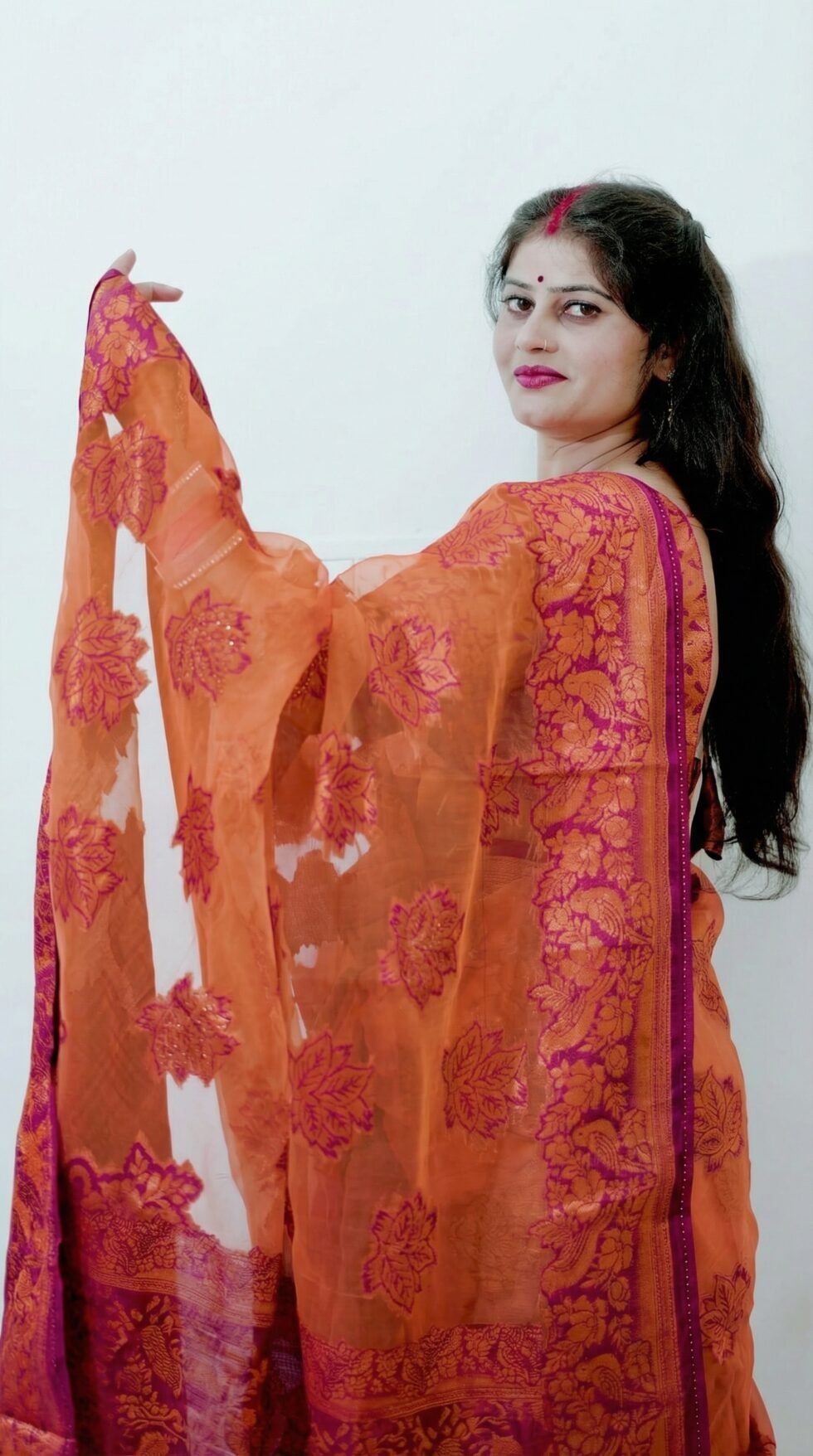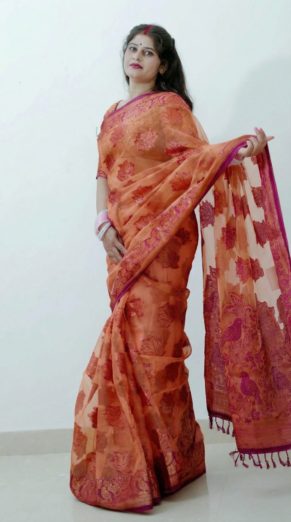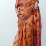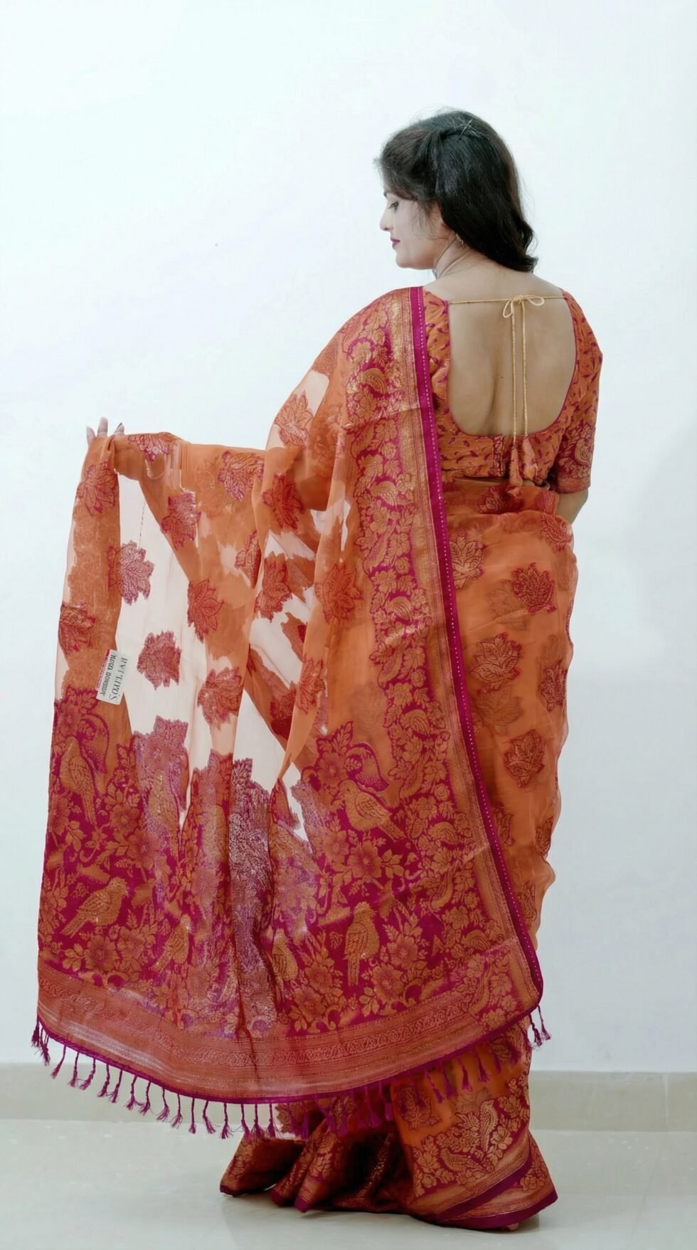 The Paython saree is beautifully crafted from Banarasi Glass Organza fabric, celebrated for its luxurious shine and premium finish. This exquisite fabric lends the saree a light yet rich feel,
