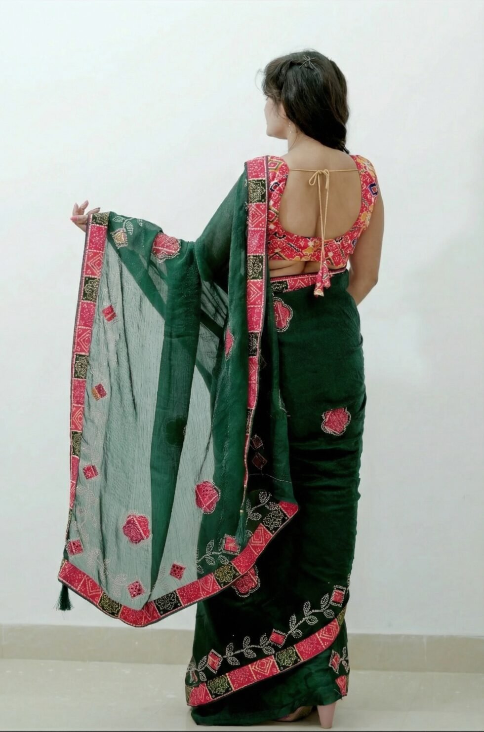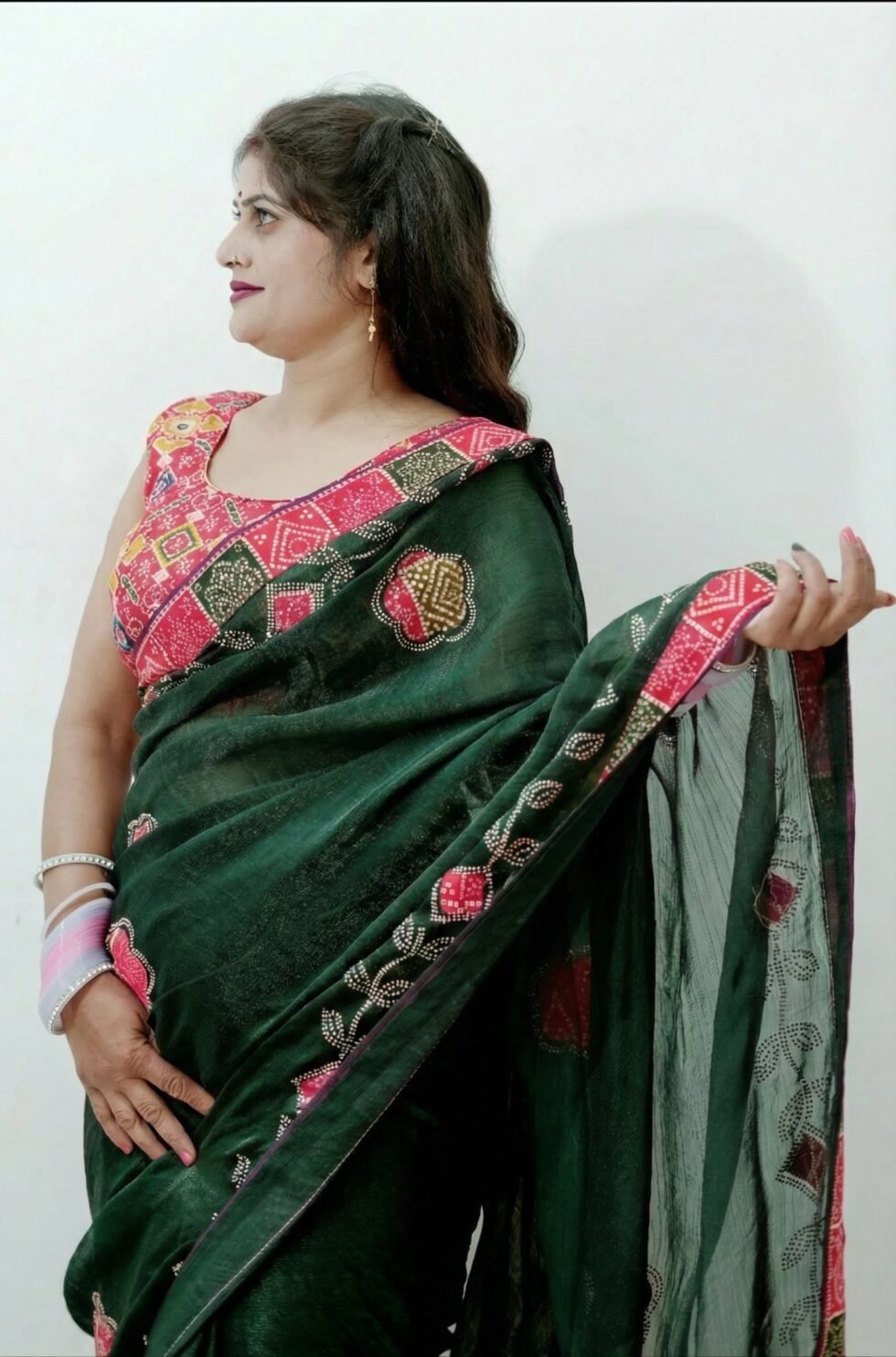 Rupesh Saree is crafted from premium Fandy fabric with a soft and comfortable feel. Featuring elegant patch work detailing and paired with a digital printed blouse, it offers a perfect blend of style, comfort, and modern elegance—ideal for festive and party wear.