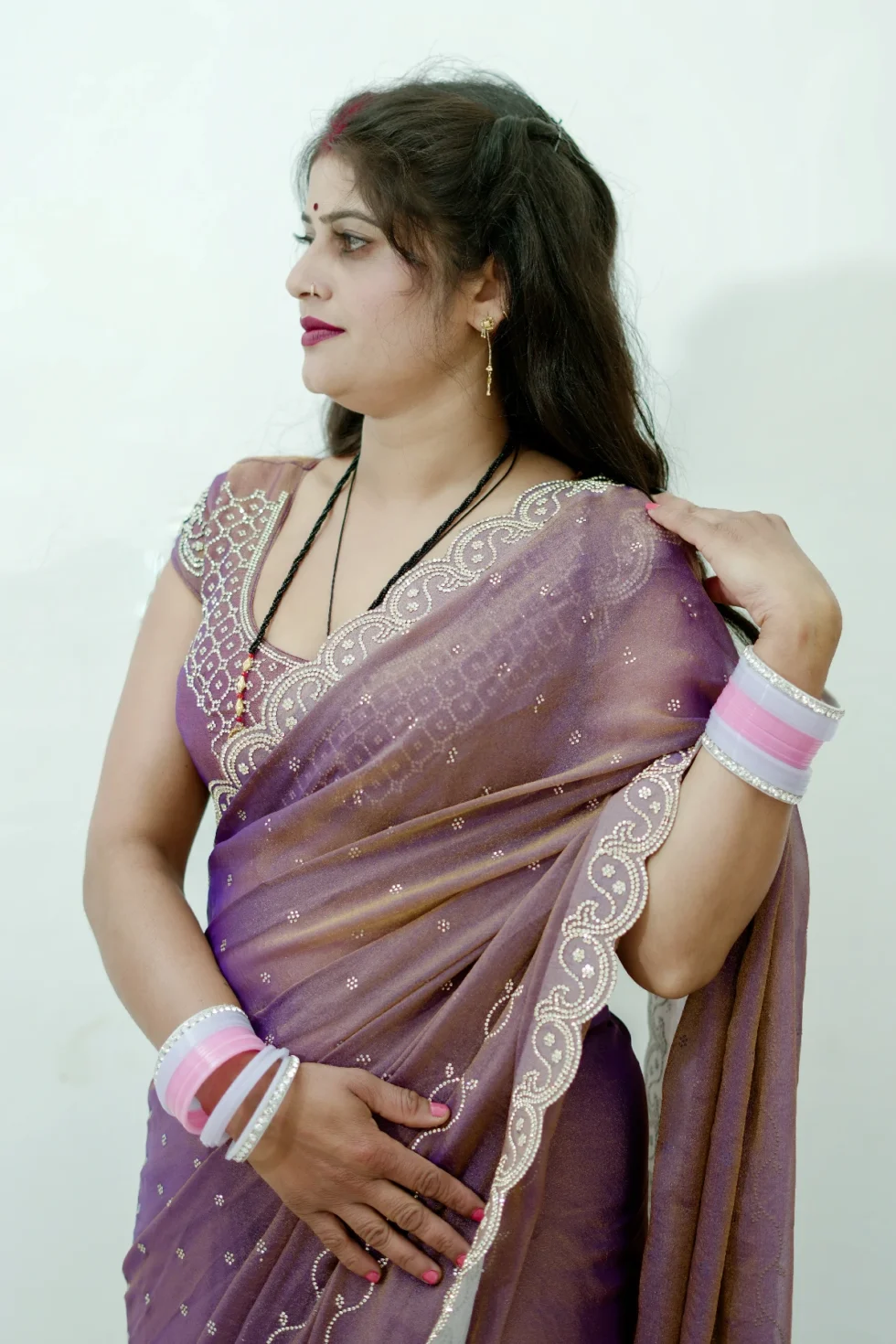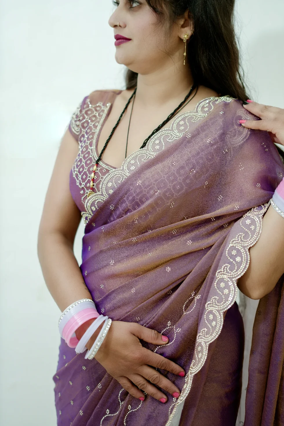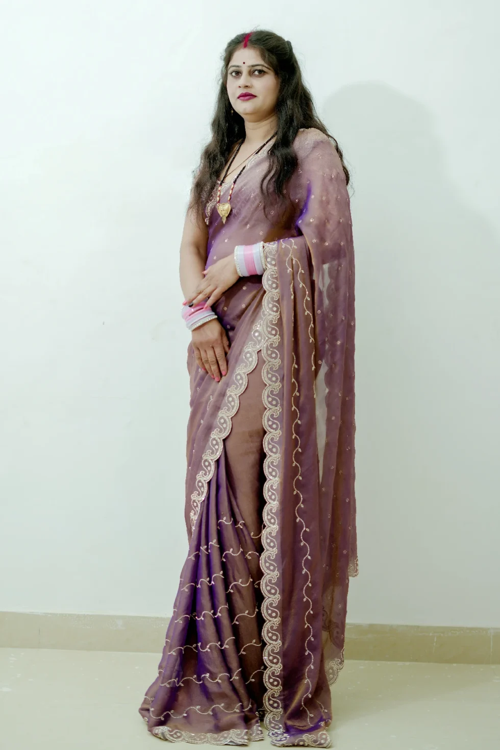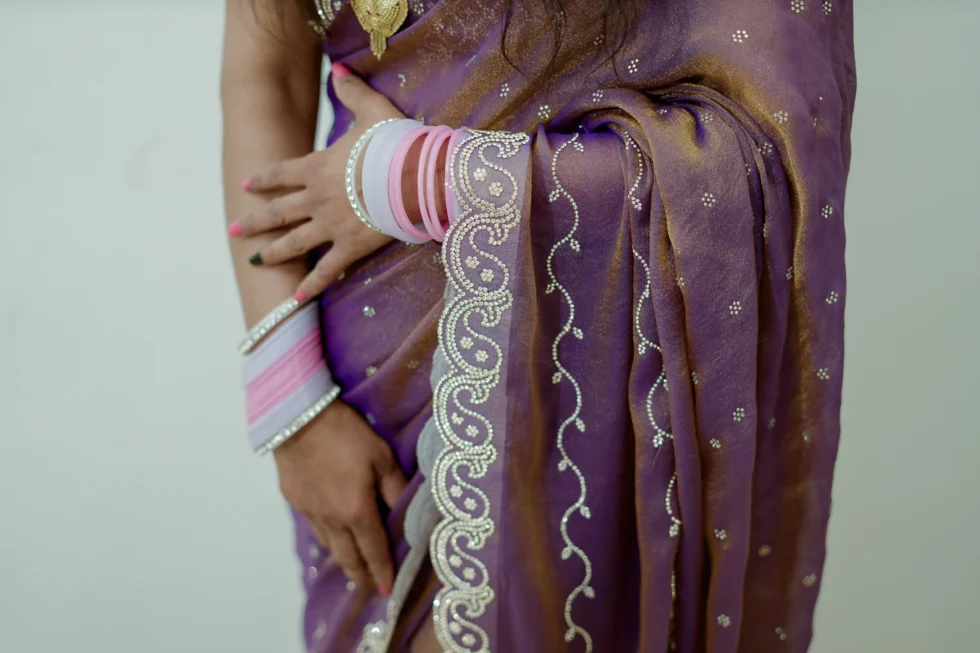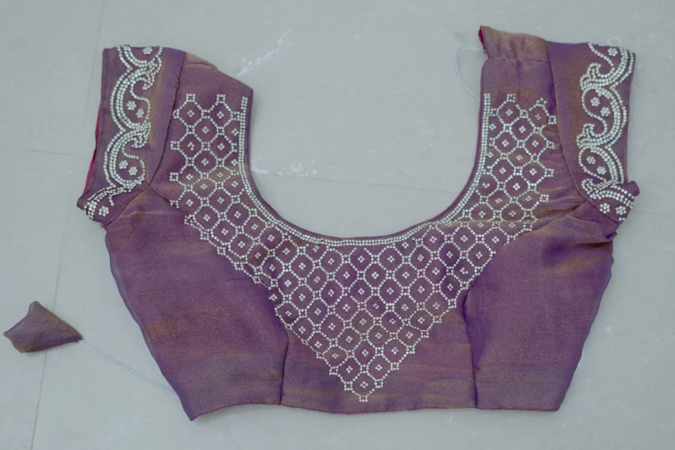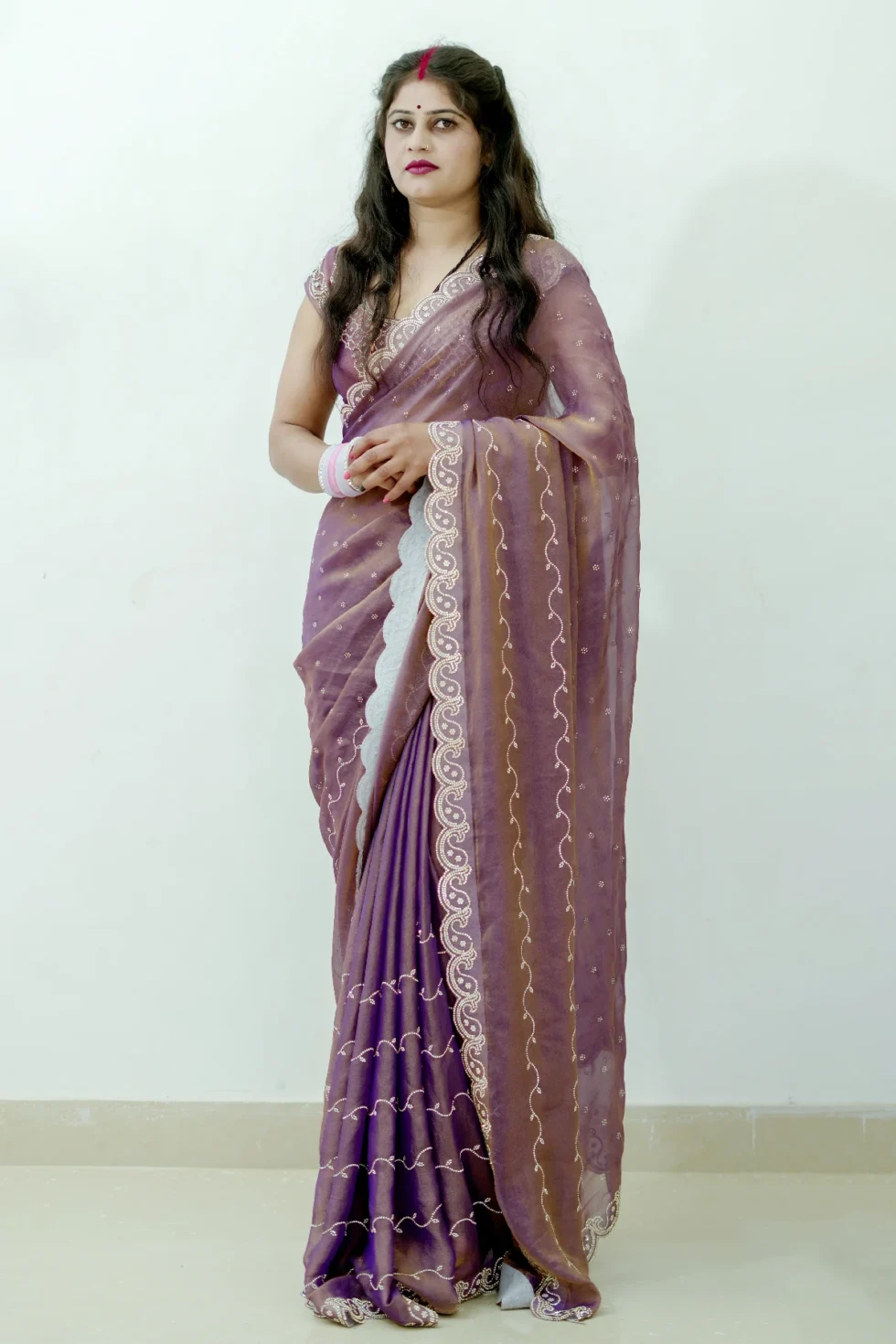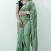 Crafted from luxurious N C Moss fabric, the Maggie Elegance saree offers a feather-light and comfortable drape. It features exquisite fine cutwork, imparting a classy and elegant appeal. The saree is also adorned with a shimmering jarkan work finish, enhancing its beauty and making it truly captivating. This saree embodies elegance and sophistication, perfect for any special occasion.